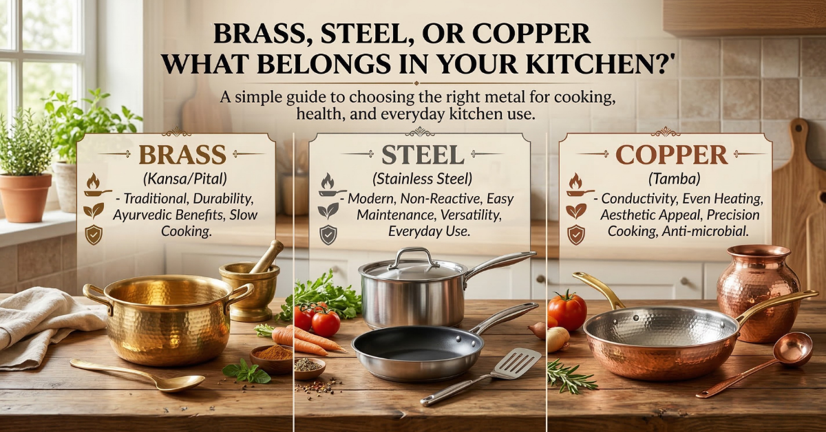 Some homes use steel utensils everywhere. Others proudly keep copper water bottles on the dining table. And in many traditional kitchens, you’ll still find brass vessels quietly doing their job.