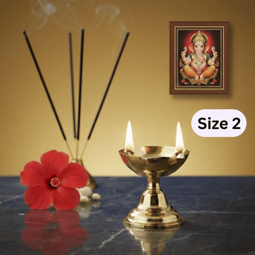 The 2-Faced Brass Dasara Panti is a timeless ritual lamp designed to elevate your daily aarti and festive pooja. Crafted in pure brass, this two-faced Brass diya with an elevated stand allows dual flames to burn steadily, symbolising balance, protection, and divine presence.