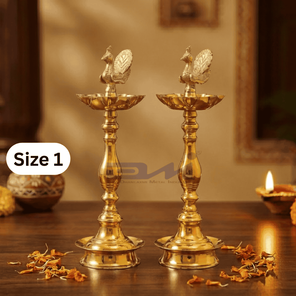 Illuminate sacred spaces with grace and divine symbolism using (Size No.1) DMI’s 7 Faced Ethnic Brass Samai – Mayur Design at Centre Plain Pattern (Pair). This large size auspicious set of two seven-faced Samai features a beautifully crafted central peacock motif, revered in Indian tradition as a symbol of purity, auspiciousness, balance, and divine beauty.