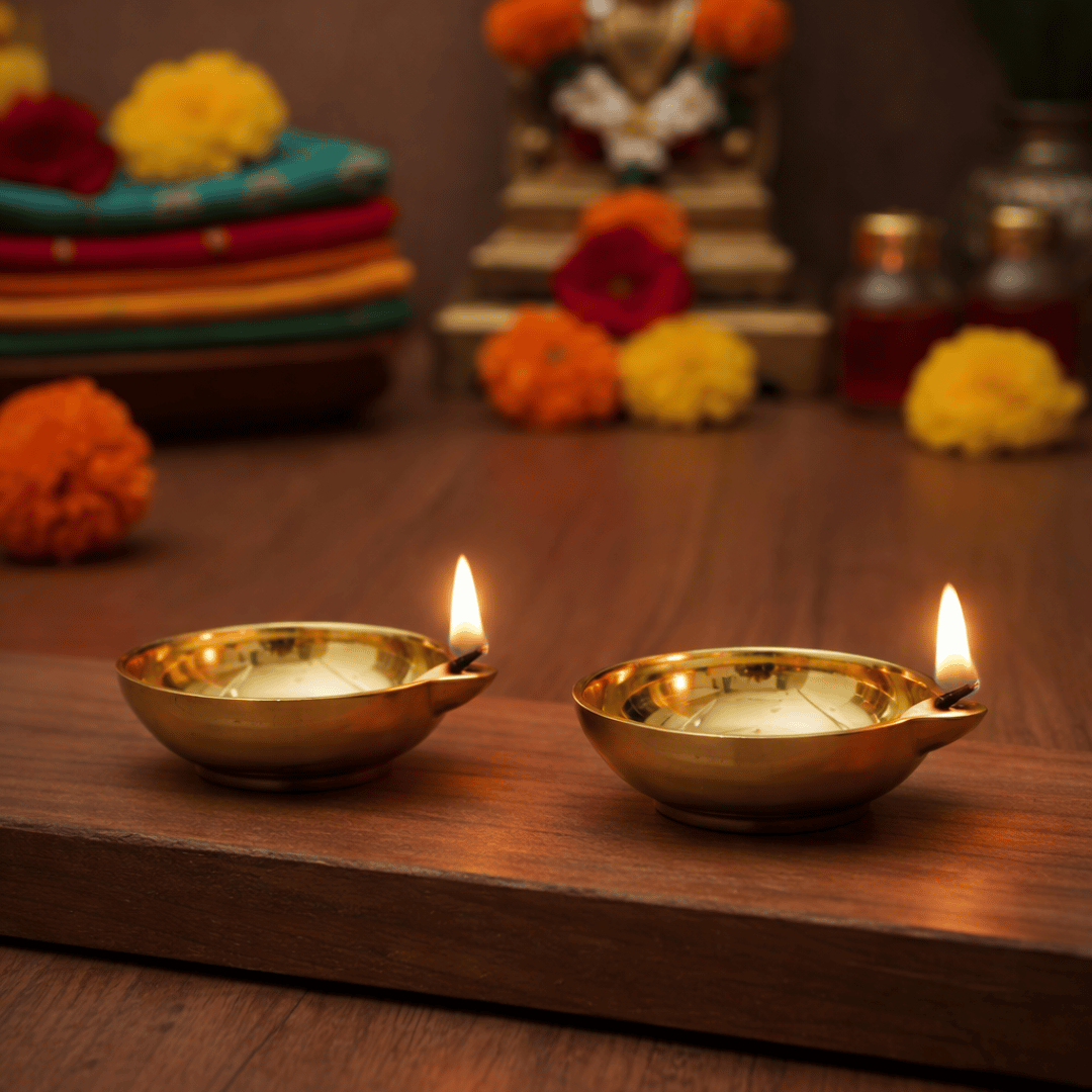 The DMI One-Faced Brass Dasara Panti / Brass Diya Size No.4  is a traditional oil diya crafted for focused and intentional puja lighting. Designed with a deep single cavity and an elegant antique brass finish, this diya reflects simplicity, devotion, and timeless ritual aesthetics.